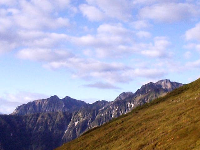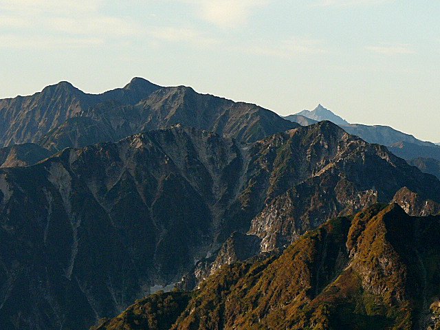 「秋の杓子岳・白馬鑓ヶ岳、奥に唐松岳・鹿島槍ヶ岳」(小蓮華山〜三国境にて)