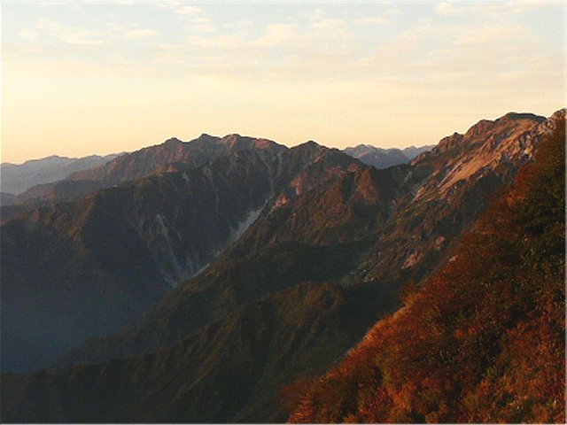 「朝焼けの初秋の白馬三山」(八方尾根・黒菱平にて)(Clickで大画面表示)