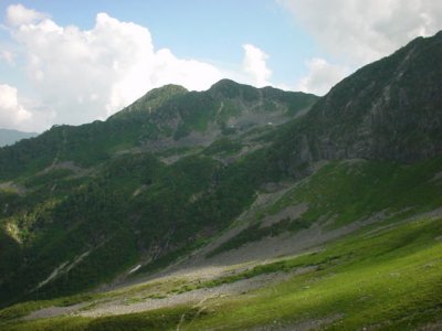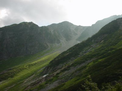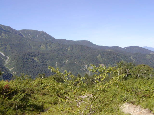 「夏の爺ヶ岳・鹿島槍ヶ岳、手前に餓鬼岳」(餓鬼岳分岐・東沢乗越手前にて)