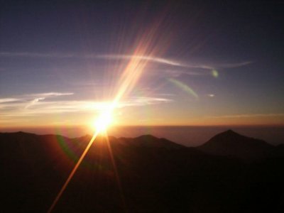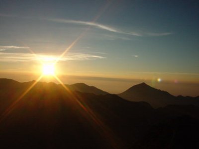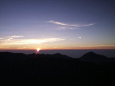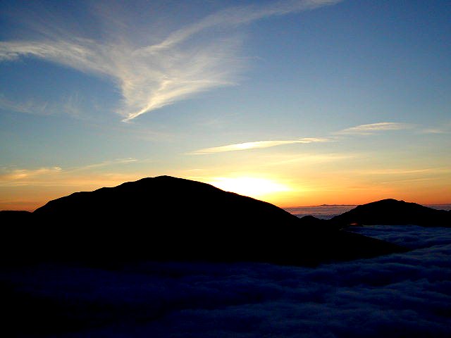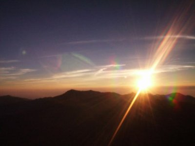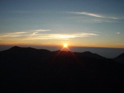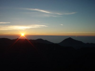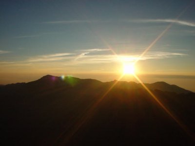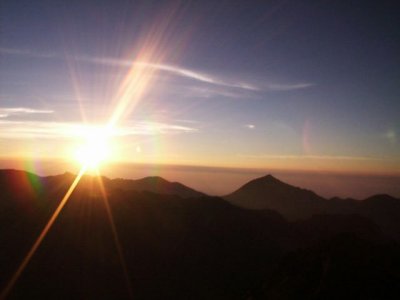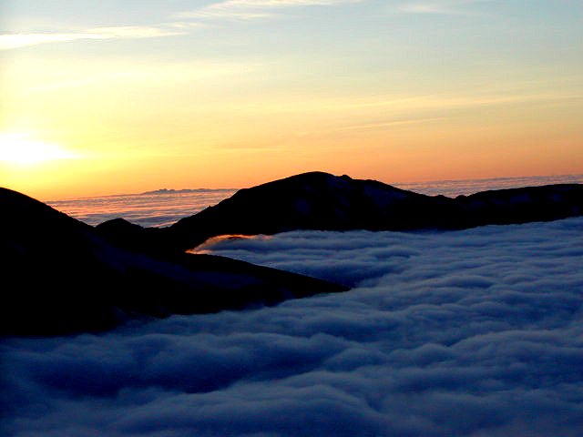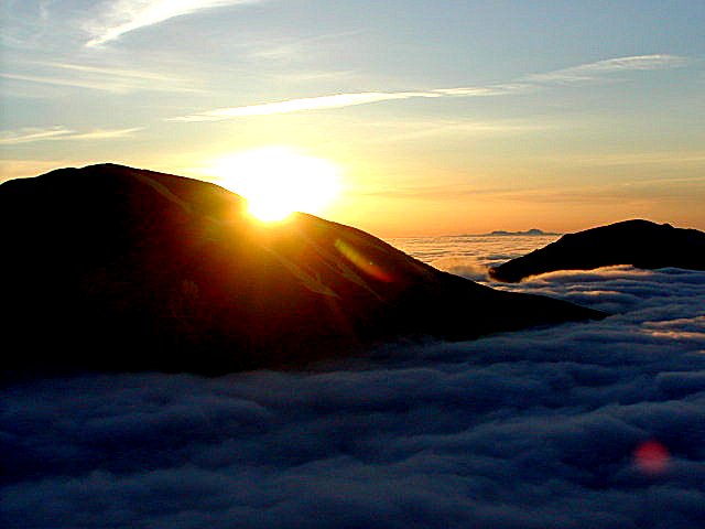 「朝日差す槍ヶ岳と穂高連峰には滝雲」(常念岳にて)
