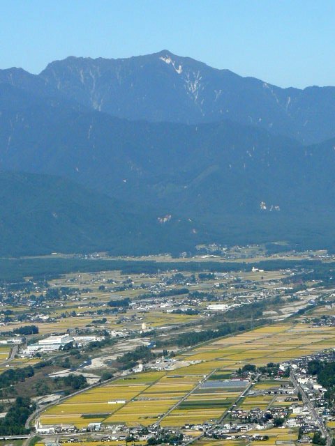 「安曇野の田園風景と初秋の常念岳」(明科・長峰山にて)