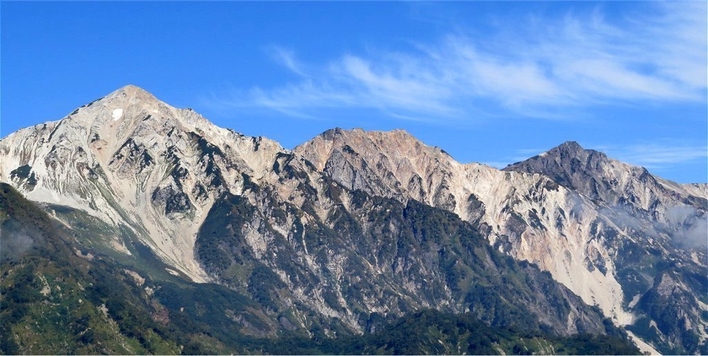 「早朝の白馬鑓ヶ岳・杓子岳・白馬岳」(黒菱林道にて)