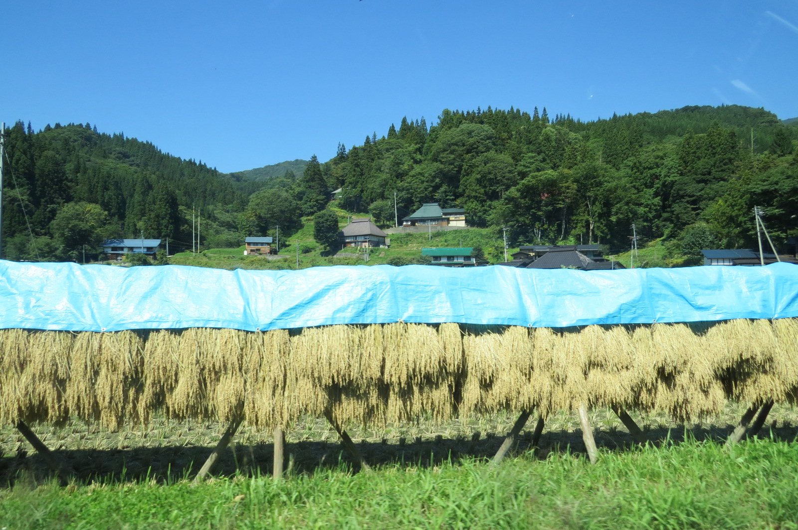 「はぜ掛けと大糸線の電車」(大町海の口にて)