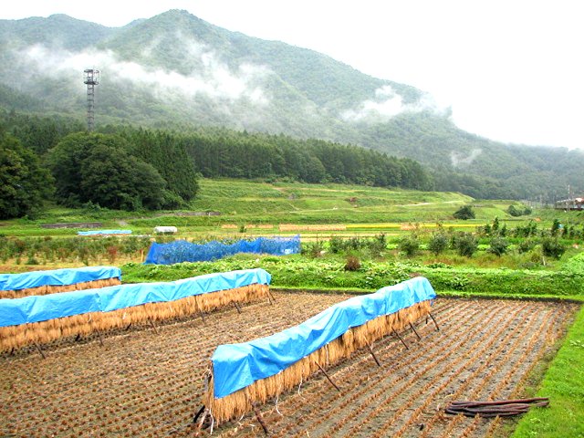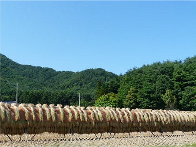 「有明山山麓の稲刈を終えた田んぼとはぜ掛け」(松川村にて)