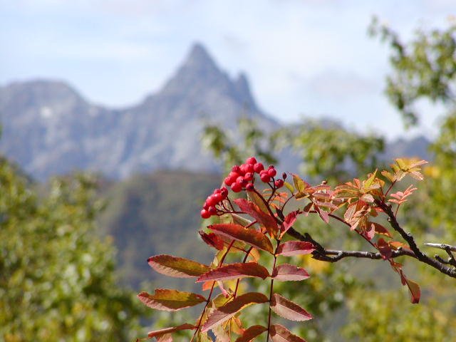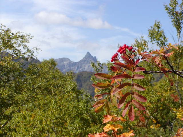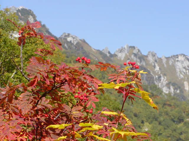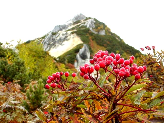 「紅葉の燕岳とナナカマドの実」(燕岳〜北燕岳〜東沢乗越にて)