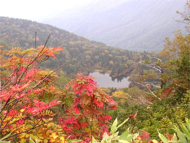 「紅葉とハート型の雁股池」(栂池自然園・ヤセ尾根にて)