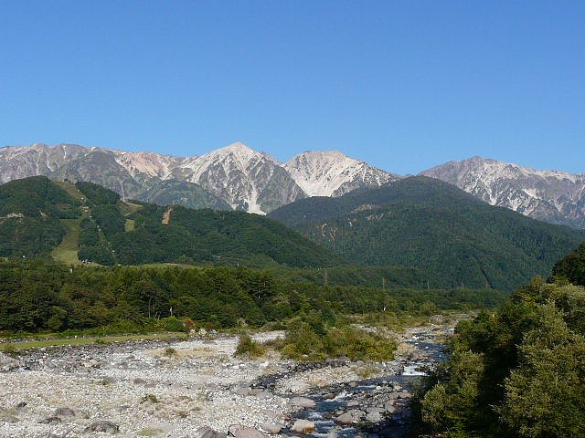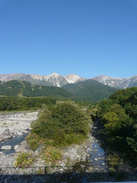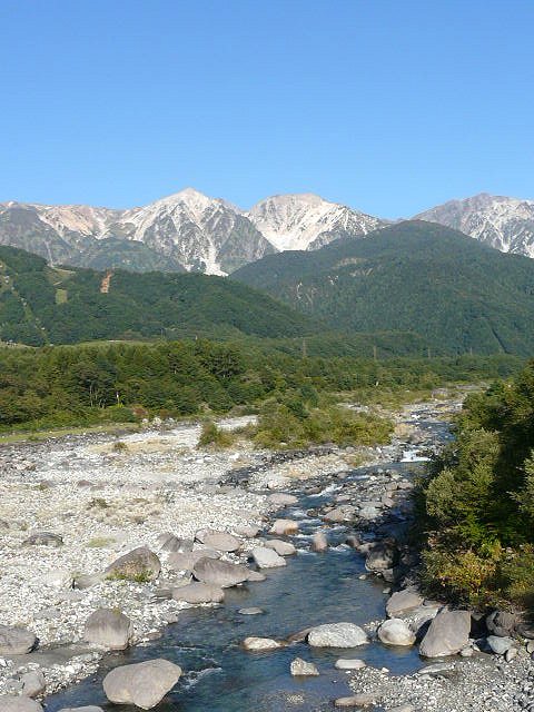 「秋空の白馬三山と松川」(白馬大橋にて)