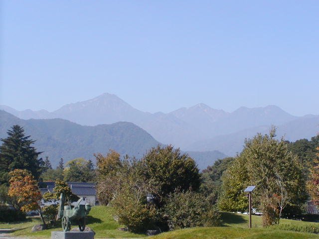 「秋の常念岳・横通岳・大天井岳」(堀金中央公園にて)