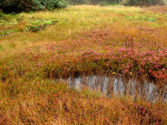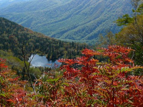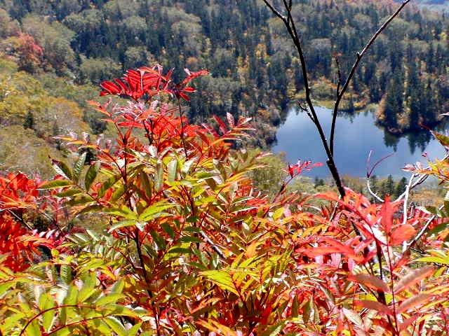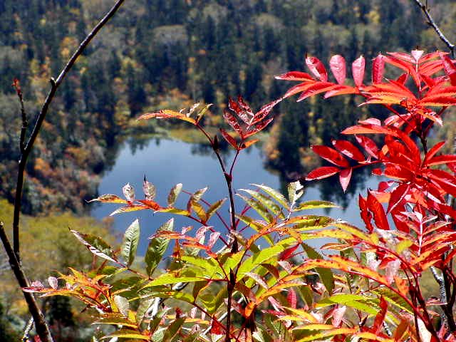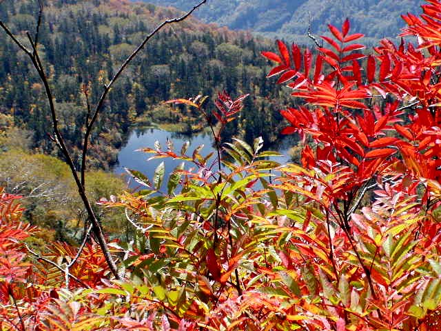 「紅葉のナナカマドとハート形の雁股池」(栂池自然園・ヤセ尾根にて)