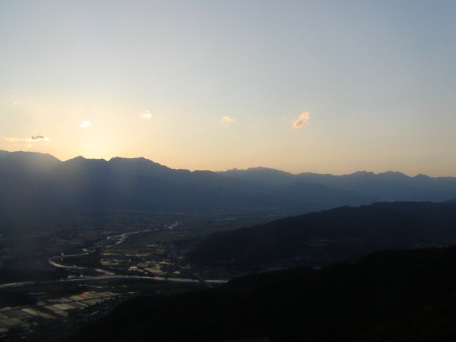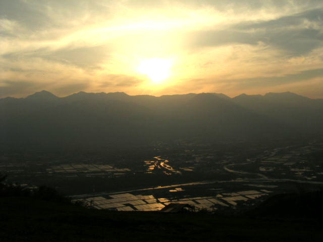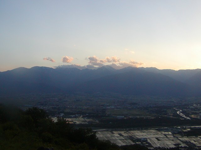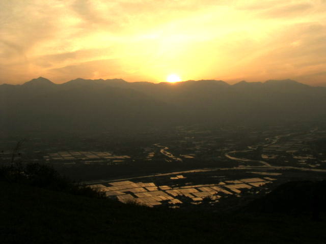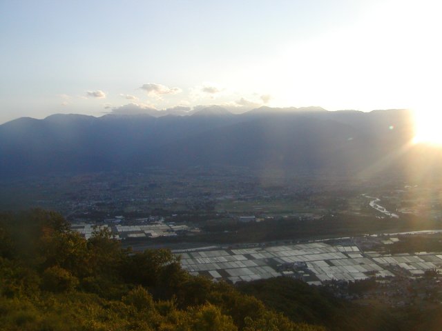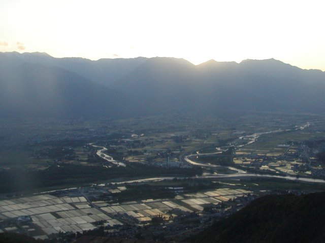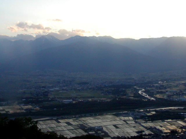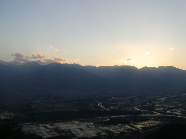 「夕日の北アと安曇野の田園風景」(長峰山にて)