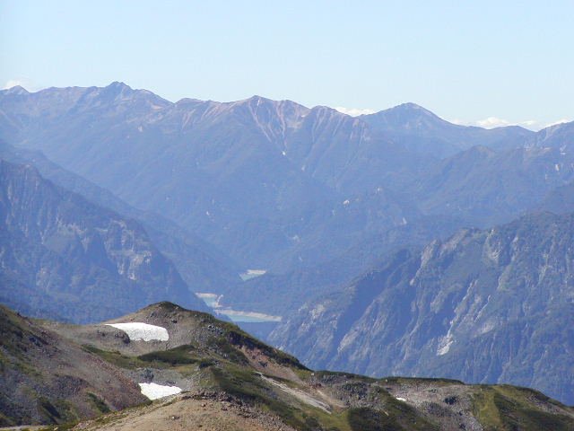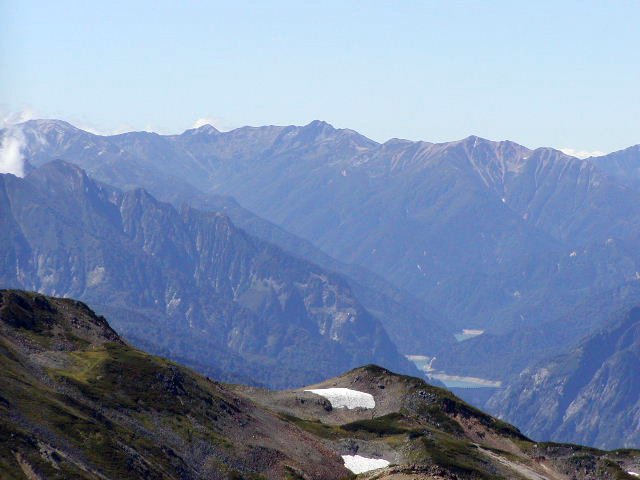 「野口五郎岳・鷲羽岳・水晶岳・赤牛岳と黒部ダム湖」(白馬鑓ヶ岳にて)