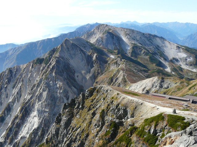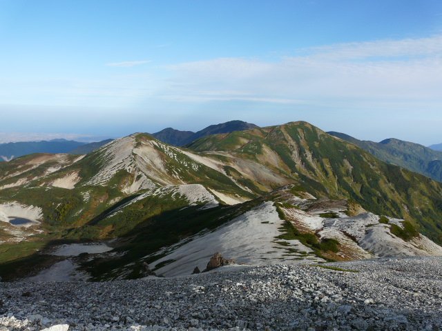 杓子岳・白馬鑓ヶ岳と白馬岳頂上宿舎(白馬岳にて)