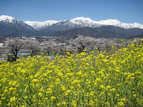 「残雪の白馬三山と菜の花畑」(白馬山麓にて)