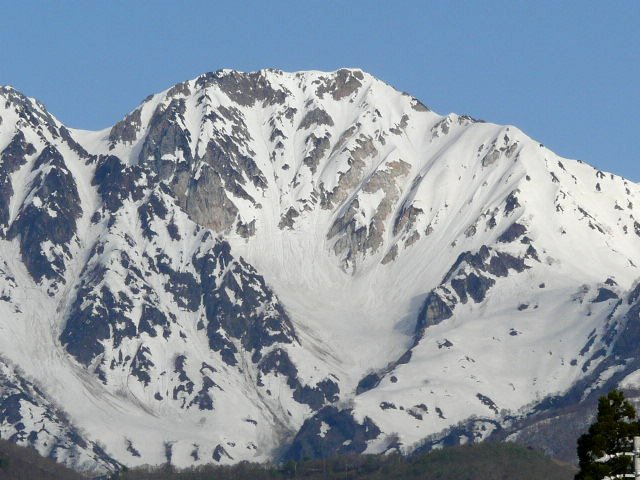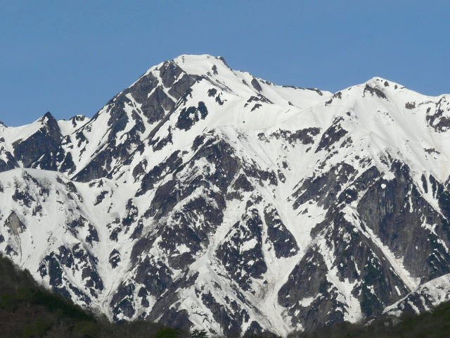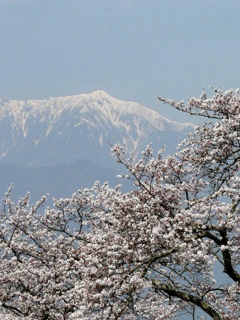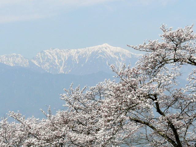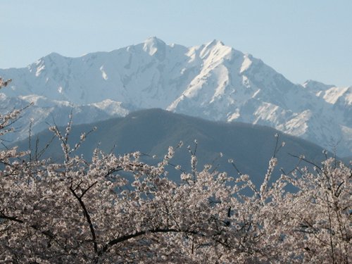 「桜と残雪の爺ガ岳・鹿島槍ヶ岳」(4/中;大町観光道路にて)