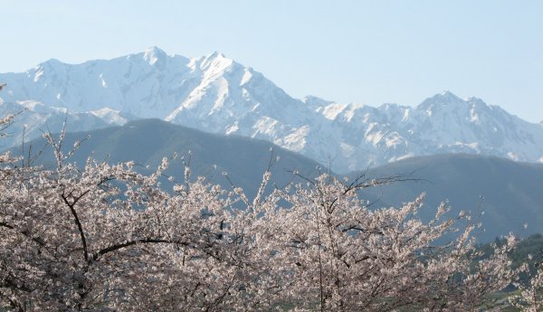 「桜と残雪の爺ガ岳・鹿島槍ヶ岳・五竜岳・白馬三山」(4/中;大町観光道路にて)