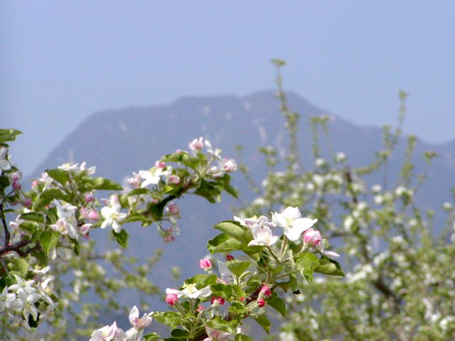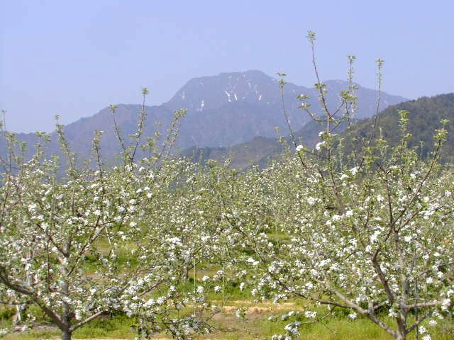 「鵜山の桜並木と信濃富士・有明山」(4/上;池田町鵜山にて)