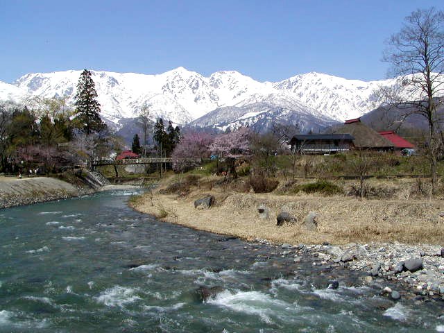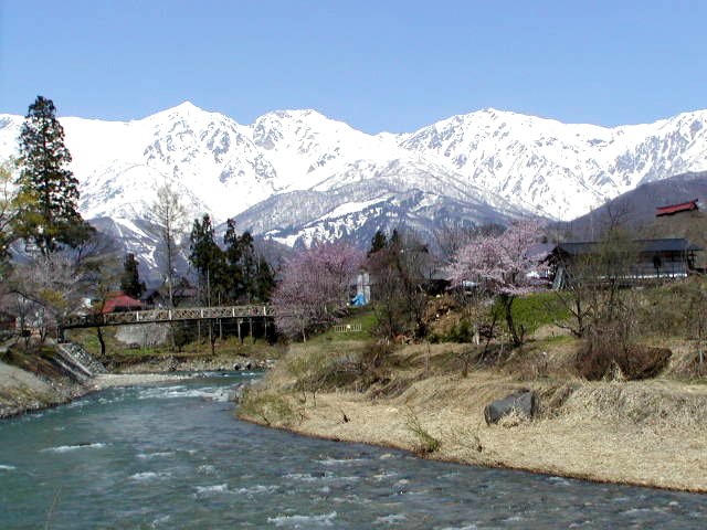 「桜咲く、姫川にかかる吊り橋と茅葺き屋根」(4/下;白馬・大出公園にて)