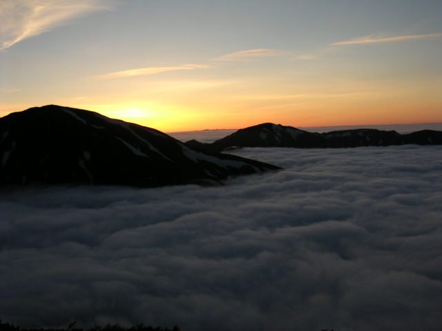 「夕焼けの雪倉岳・朝日岳」(雷鳥坂にて)