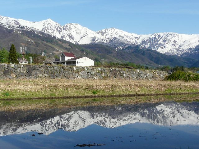 「残雪の白馬三山と水鏡」(白馬山麓にて)