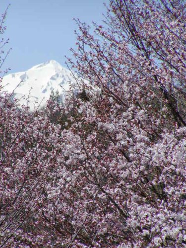 「桜と残雪の爺ガ岳・鹿島槍ヶ岳」(4/中;大町観光道路にて)