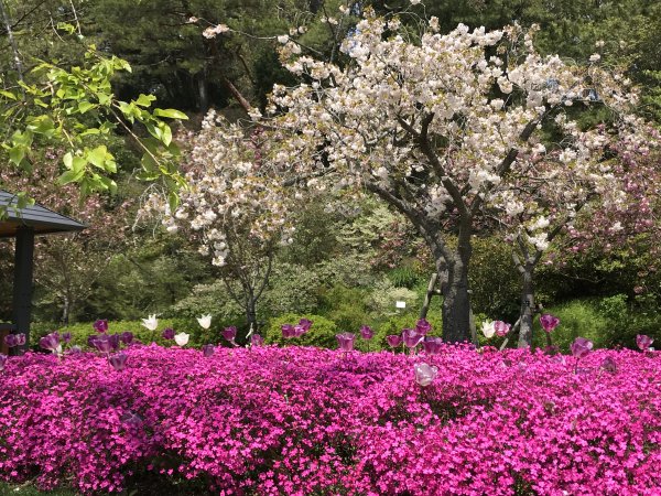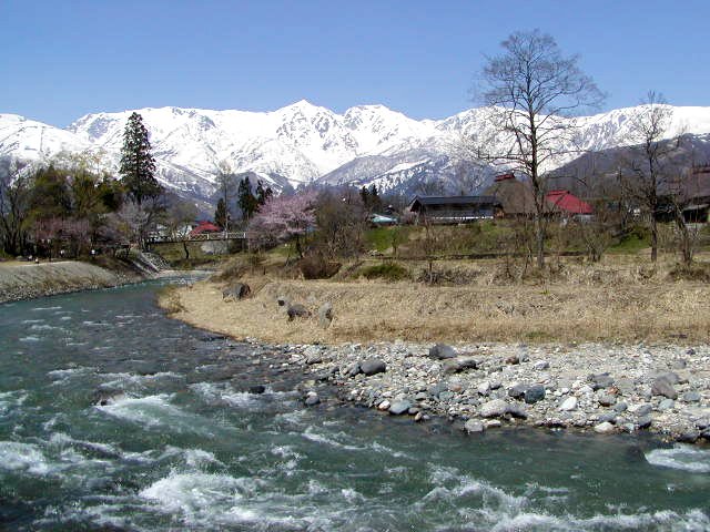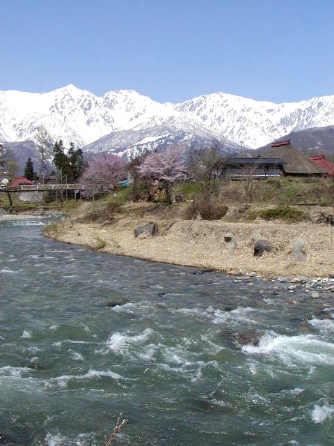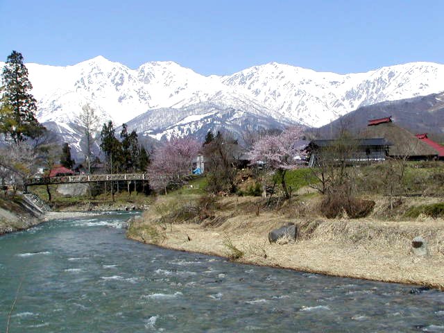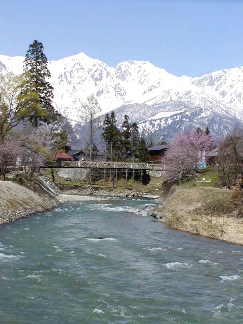 「桜咲く、姫川にかかる吊り橋と茅葺き屋根」(4/下;白馬・大出公園にて)