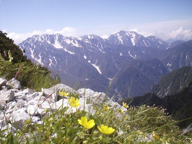 北には北燕岳(2723m)、餓鬼岳(2647m)・唐沢岳(2633m)、蓮華岳(2799m)、針ノ木岳(2821m)、爺ヶ岳(2670m)、鹿島槍ヶ岳(2889m)、奥に白馬岳(2932m)と旭岳(2867m)が望めます。