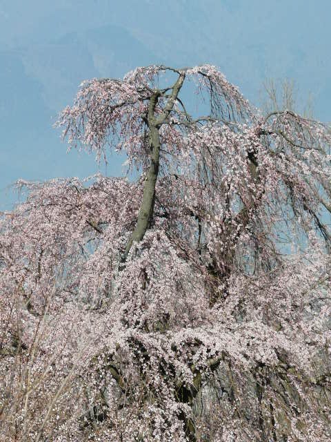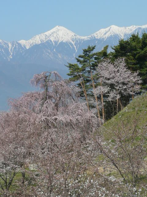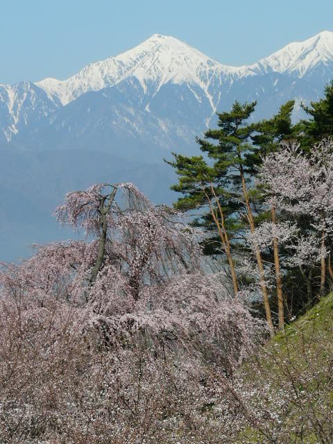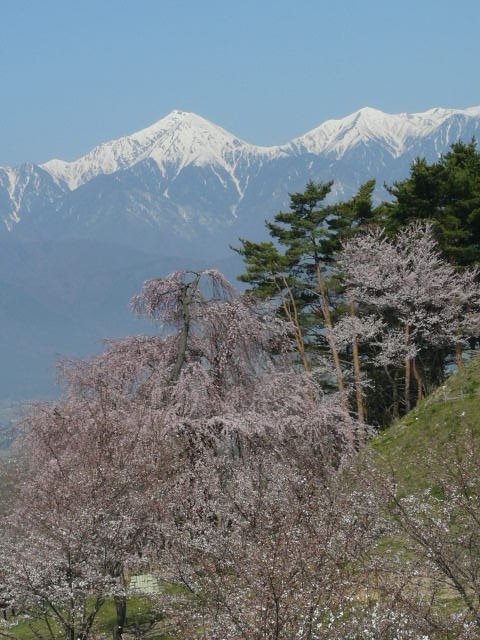 「常念岳と泉小太郎のしだれ桜」(松本アルプス公園)