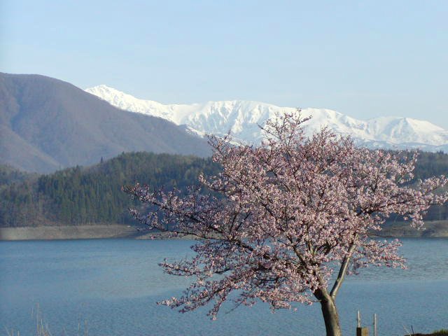 「桜と残雪の爺ガ岳・鹿島槍ヶ岳」(4/中;大町観光道路にて)