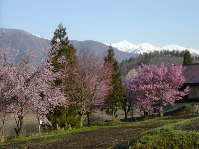 桜と爺ヶ岳・鹿島槍・五竜岳(三郷・黒沢川にて)