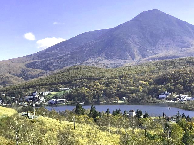 「秋の蓼科山と白樺湖」(白樺湖展望台にて)