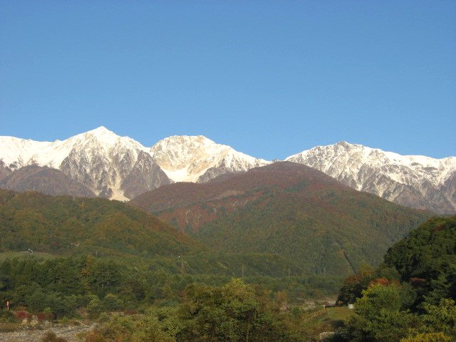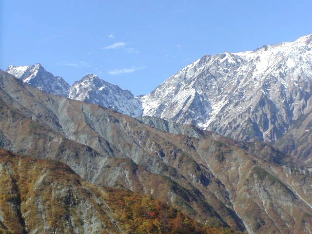 「冠雪した白馬三山と秋の黒菱」(黒菱林道にて)