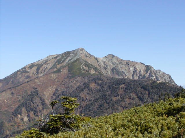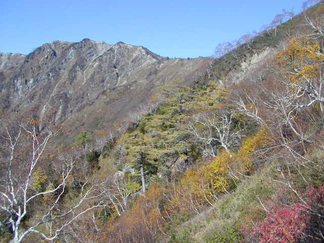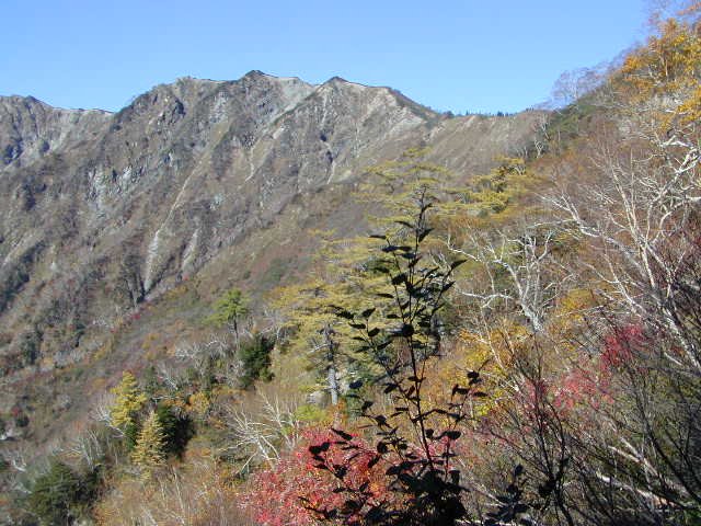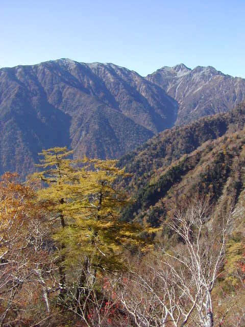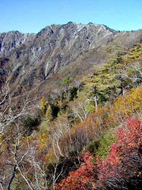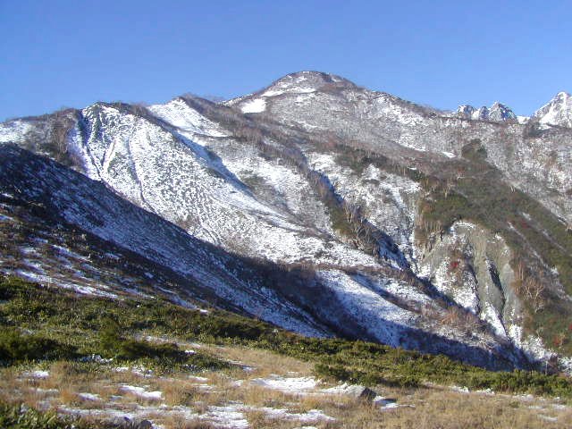 「冠雪した杓子岳と秋の黒菱」(黒菱林道にて)