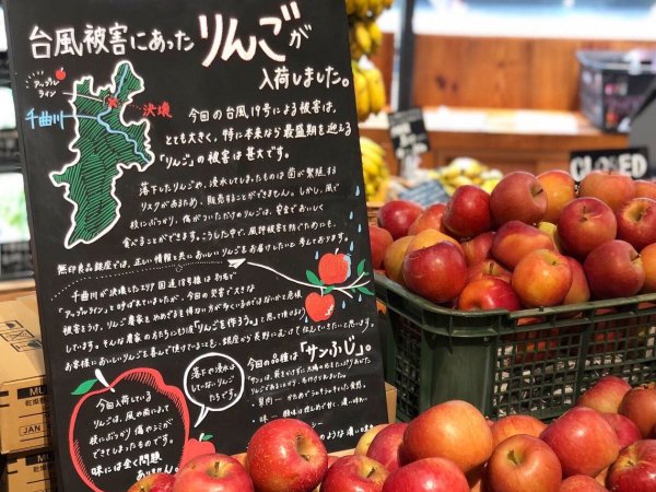 リンゴ売場には、こうメッセージが書かれた黒板が掲げられ、被災地の様子が店内のモニターに映し出されていた。店では千曲川の堤防決壊現場の両岸に位置する長野、須坂のリンゴ農家から仕入れたブランド品種「サンふじ」を販売。