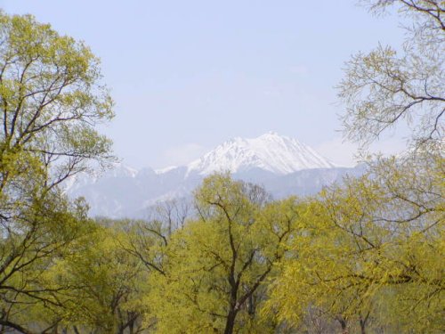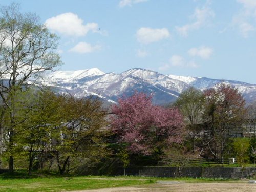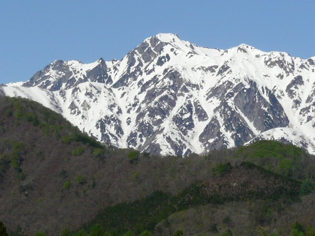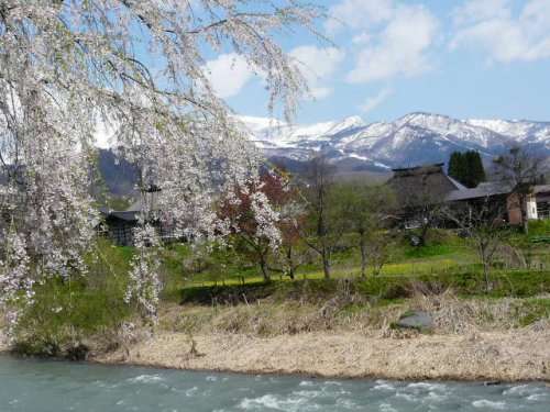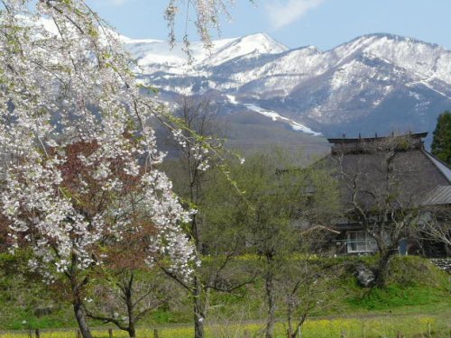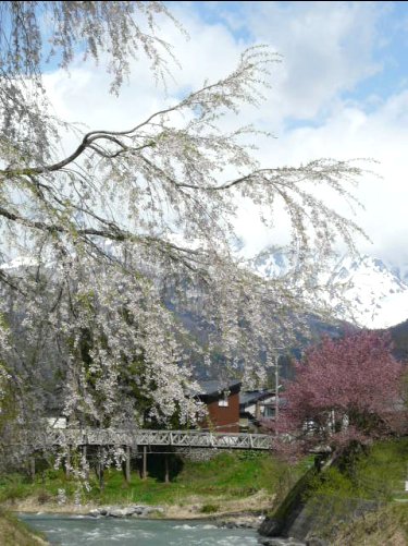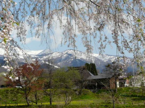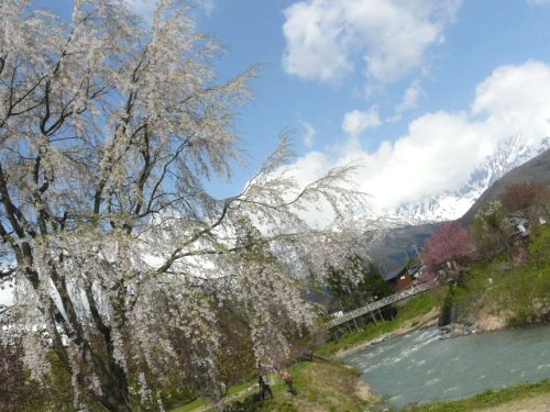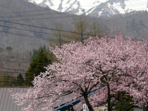 「桜と爺ヶ岳・鹿島槍ヶ岳・五龍岳」(三郷温にて)