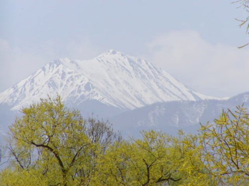 「光城山の桜と常念岳・横通岳」(豊科・光城山にて)