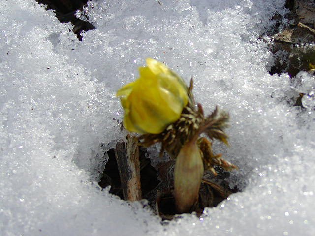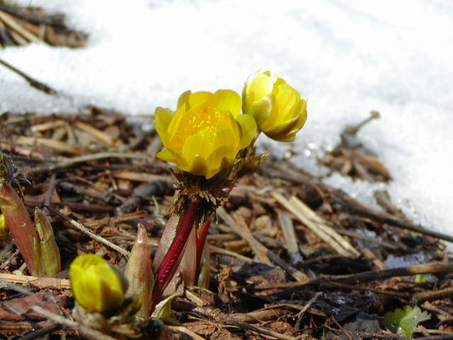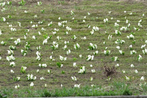 「雪原に雪解けの座禅草」(大町・居谷里湿原にて)