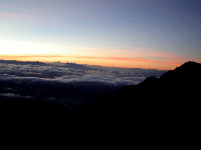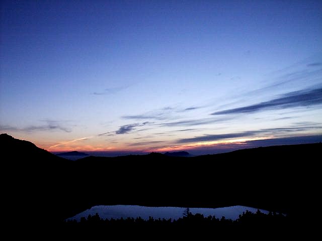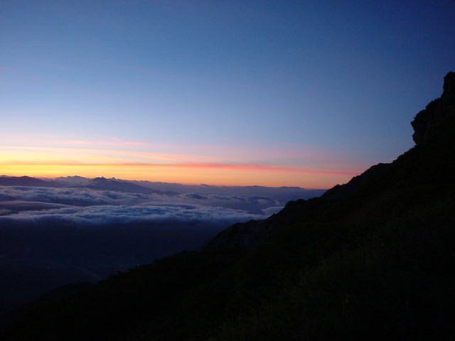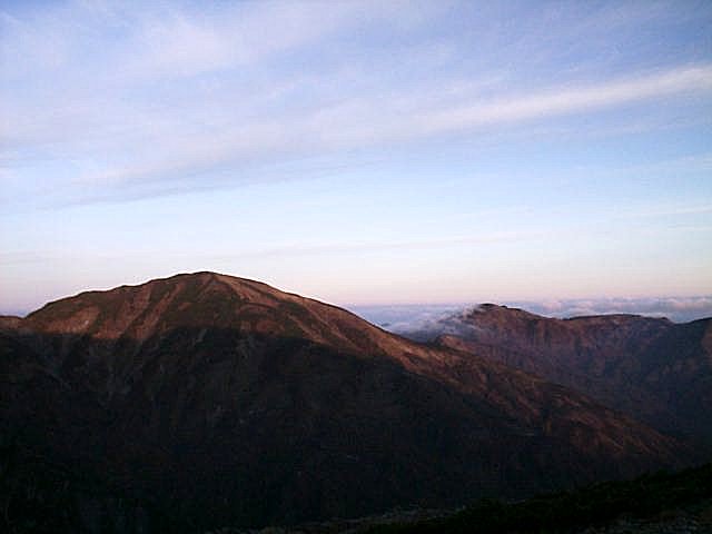 「夜明けの小蓮華岳・鉢ヶ岳・雪倉岳」(白馬大池にて)