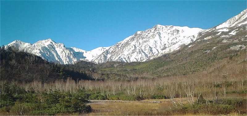 「冠雪した杓子岳・白馬大雪渓・白馬岳」(栂池自然園)