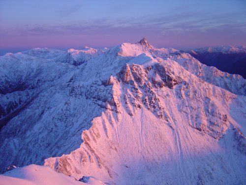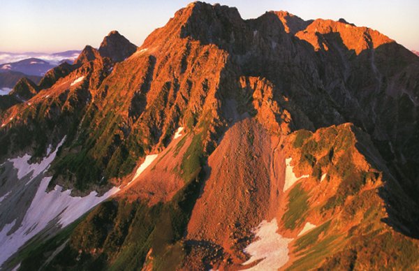 「朝日に染まる北穂高岳」(南岳)(佐々木信一氏撮影)