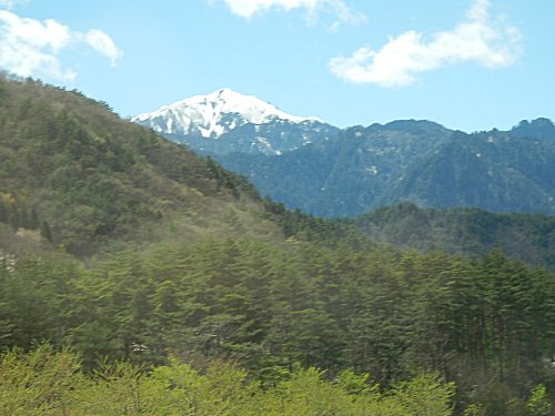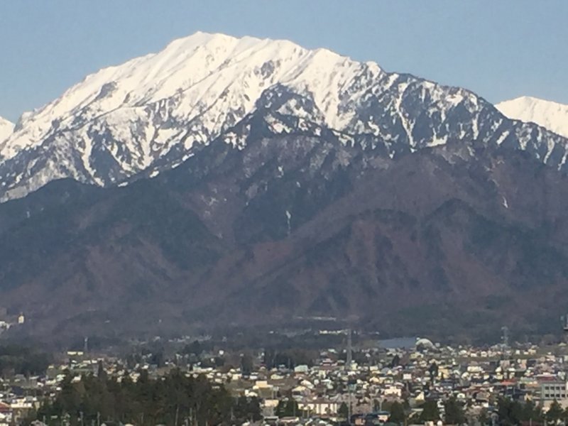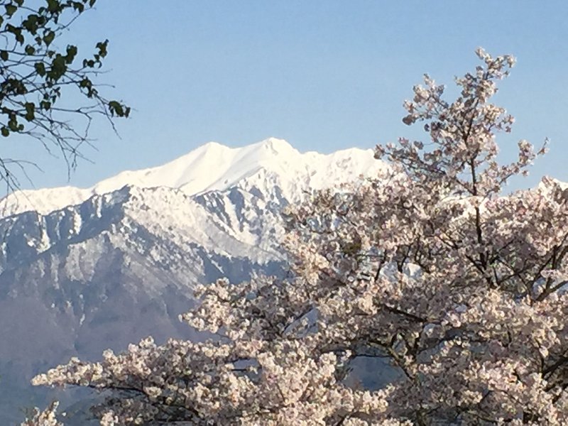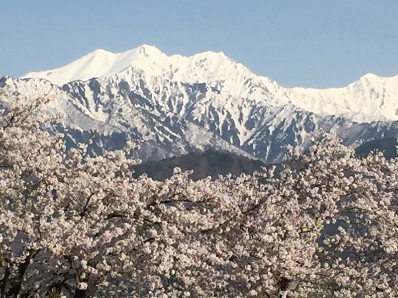 「残雪の爺ヶ岳と桜」(大町観光道路)