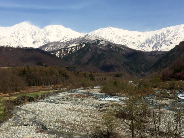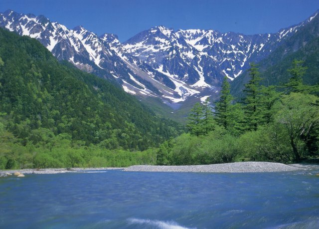 「清流迸る梓の流れと穂高連峰」(5月:稜線2016)(佐々木信一氏)