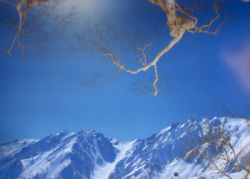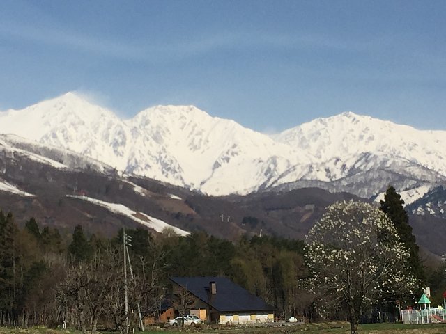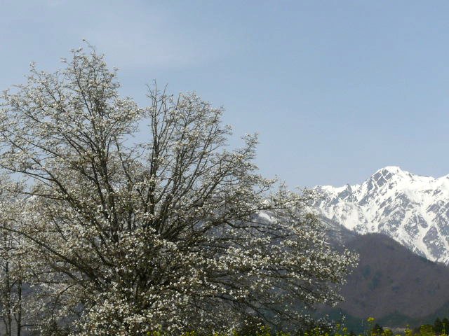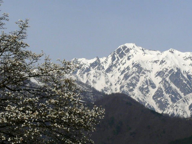 「白馬・四十九院のコブシと残雪の五竜岳」