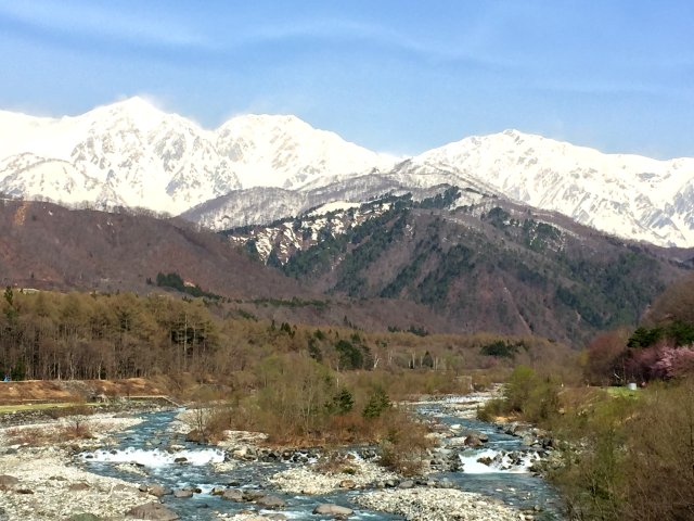 「残雪の鹿島槍ヶ岳・五竜岳と桜」(大町観光道路)