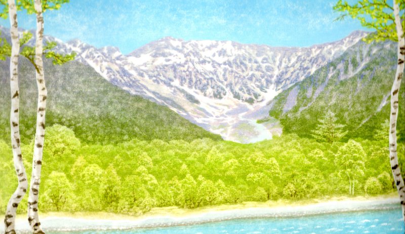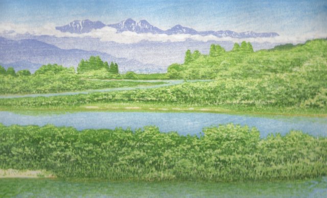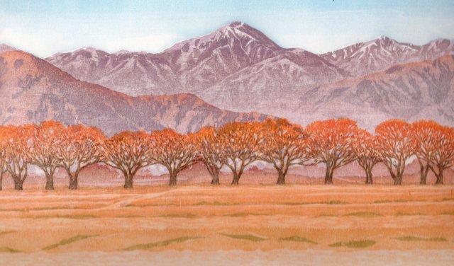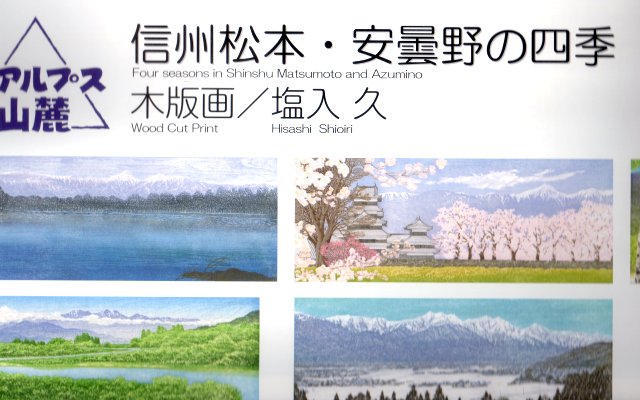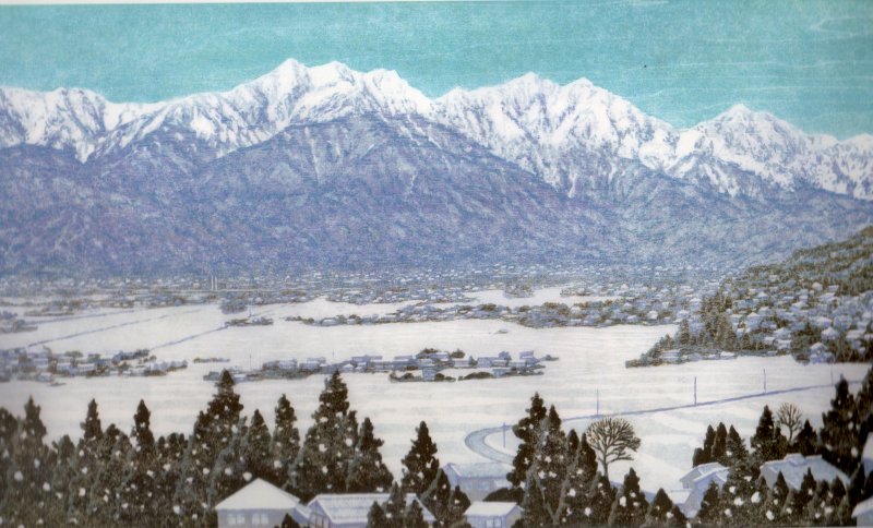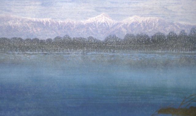 「北アルプス 信州松本・安曇野の四季」(2017年木版画 塩入久)