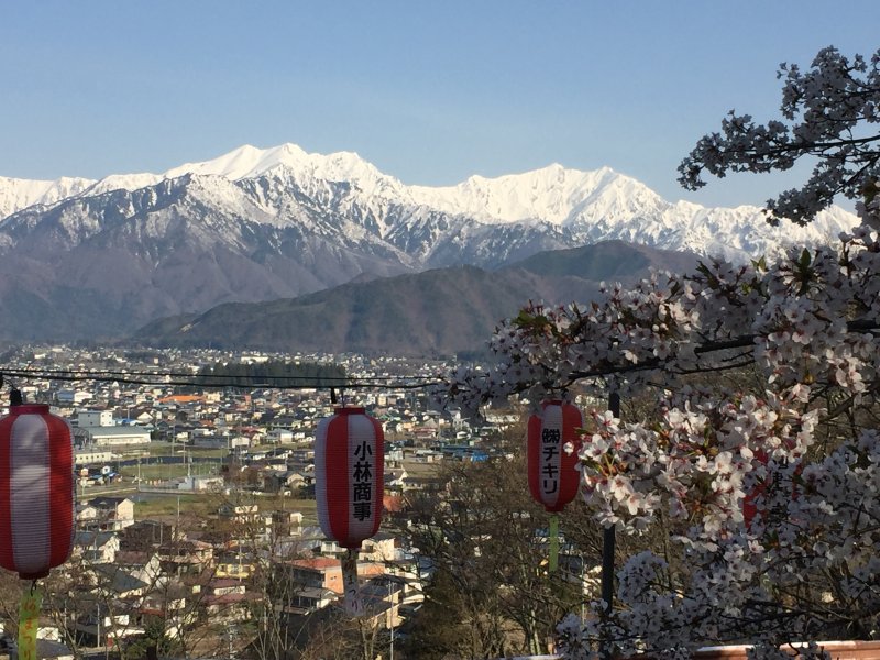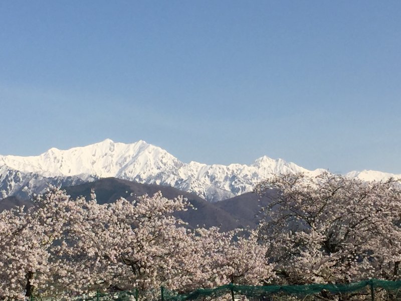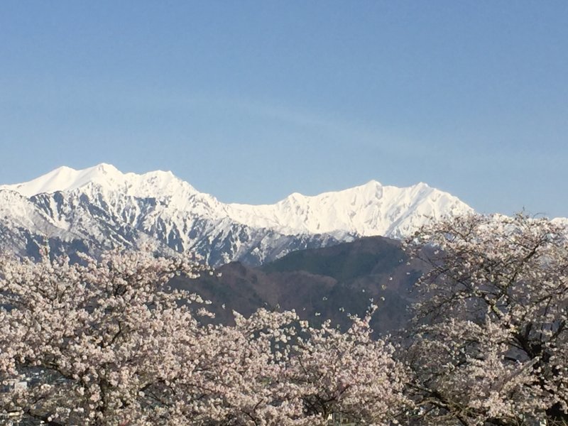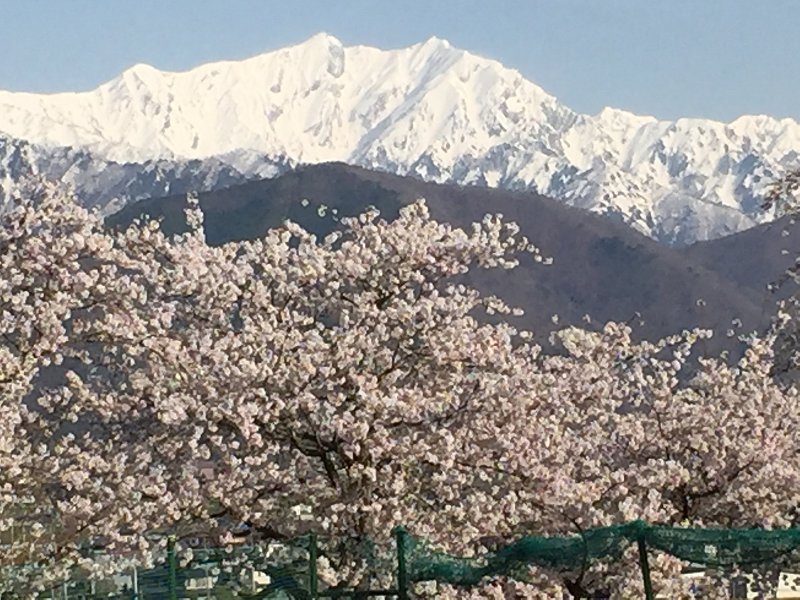 「残雪の鹿島槍ヶ岳と桜」(大町公園)