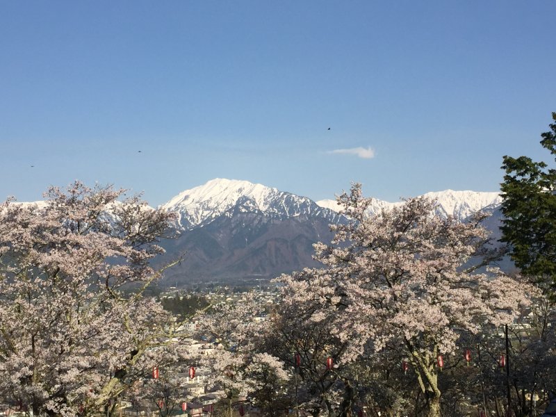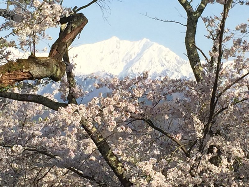 「残雪の爺ヶ岳・鹿島槍ヶ岳と桜」(大町公園)