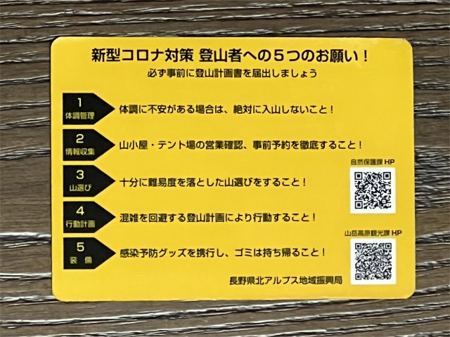 「コロナ対策登山者へのお願い」(裏)(県北アルプス地域振興局)
