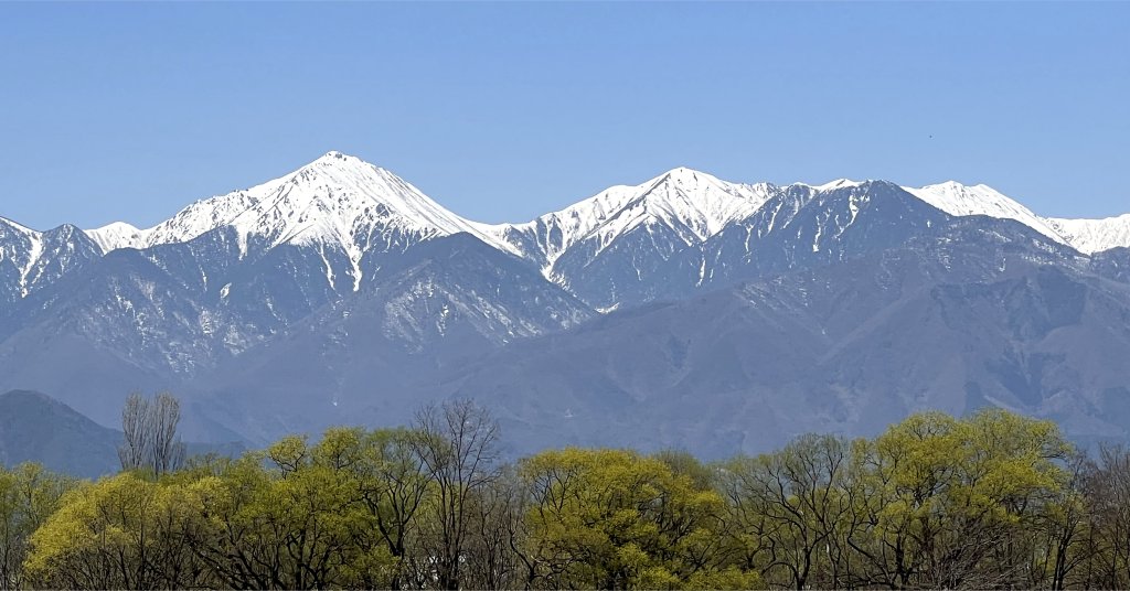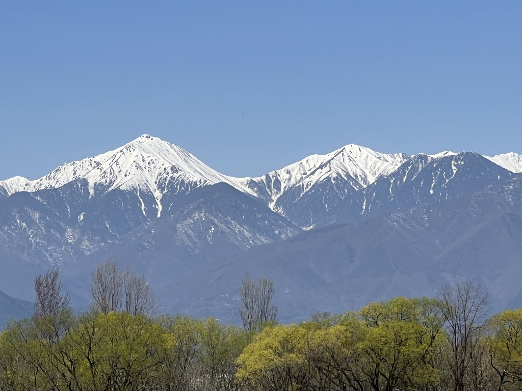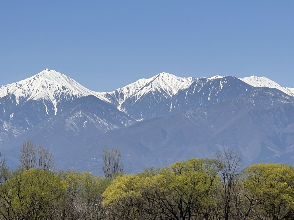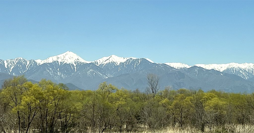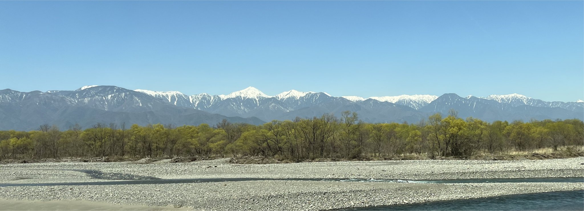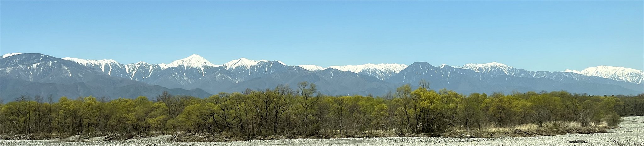 「春の犀川河川敷と残雪の北アの峰々」(松本島内下田にて)