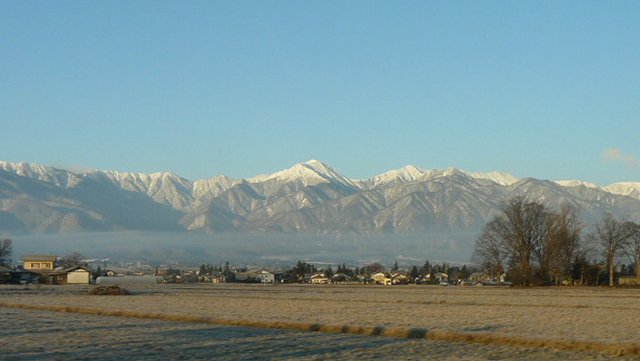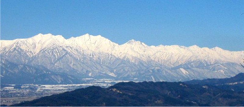 「雪の爺ヶ岳・鹿島槍ヶ岳と大町市内」(池田町にて)