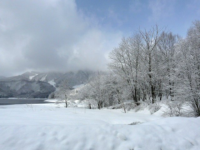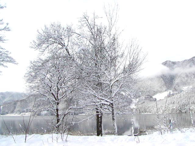 「雪積もる青木湖畔」(大町・青木湖にて)